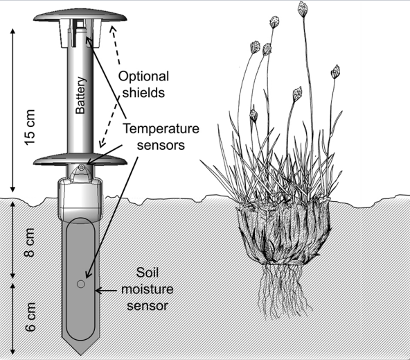 标准型 TMS,总长约 30 cm,(插入土壤后)地面部分约 15 cm,在+15、0 和 -8 cm 之处分别内置 Ibutton 温度传感器(型号:DS7505U+),对应测量空气、地表和土壤温度。这个位置反映了植物的叶子、越冬的芽和根的位置(图 1)。TMS 记录仪的底部是一个探针,采用 TDT 技术(Time Domain Transmission),用于测量土壤体积含水量,插入深度约为 14 厘米。TMS 记录仪测量的微气候变量与生活在地面附近或上层土壤中的所有生物有关。此外,TMS 设备可测量影响许多生态过程的微气候变量,包括那些与水和能量平衡有关的过程。