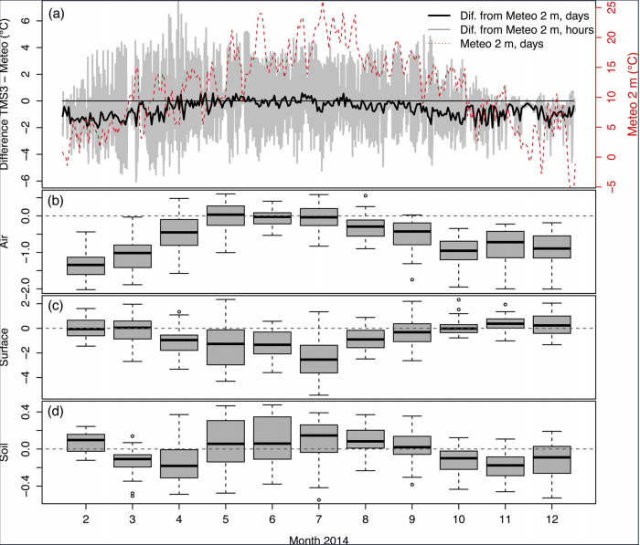 为了说明 TMS 数据记录仪测得的温度与标准气象数据有何不同,我们将 TMS 设备测得的温度与官方水文气象站(以下简称气象站)记录的温度进行了比较。捷克水文气象研究所的气象站(50°0'2''N,14°33'4''W,312m a.s.l.)位于布拉格附近,配有 METEOS 5 自动测量站。TMS 设备在距地面 15 厘米处记录的气温比距地面 2m 的气象站记录的气温变化更大(由于温度是在不同的高度和不同的仪器设置下测量的,因此不能将这种比较视为准确性评估,但是它可以帮助您了解地面附近的微气候与常规气象站的测量结果有何不同)。小时测量值的差异介于 +8.45 和 -6.05°C 之间(图 2a)。从 TMS 记录器获得的气温日均值总体上低于通过气象站测量获得的日均值,但两者之间的差异远小于每小时记录的差异(平均差异为 -0.58°C)。这些差异在冬季更大,范围为 -2.02 至 0.6°C(图 2b)。TMS 记录仪的表面传感器和气象站上的非屏蔽地面传感器记录的温度比较显示出相反的趋势。来自土壤传感器的数据仅略有不同(图 2d)。TMS 记录仪和气象站测量的土壤温度之间的细微差异(另请参见表 1)表明,TMS 和气象站测量之间的差异不是由不同的温度传感器引起的,而是由地面上方的不同位置及不同的屏蔽引起的。