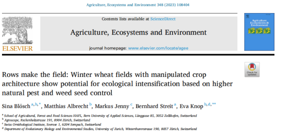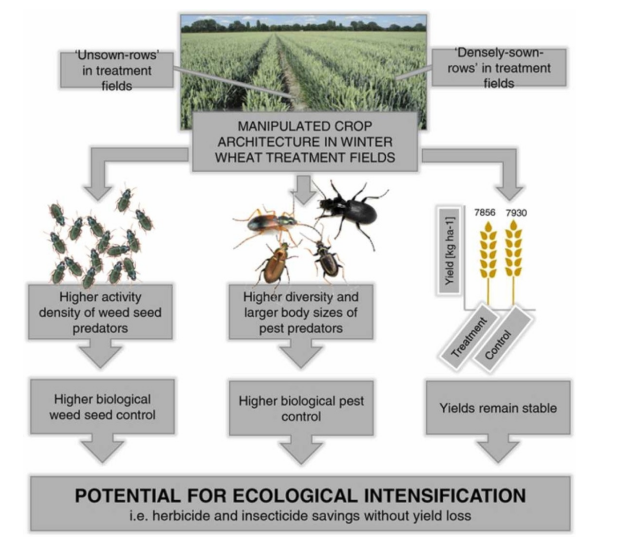 原文题目:Rows make the field: Winter wheat fields with manipulated crop architecture show potential for ecological intensification based on higher natural pest and weed seed control.