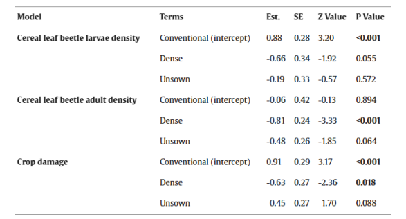 表4.解释不同作物结构(conventional指对照田中‘常规播种行’(无操纵作物结构);dense指处理田中‘密播行’,unsown指处理田中‘未播种行’(有操纵作物结构))之间旗叶上谷物叶甲幼虫密度、第二代成虫及作物损害差异的广义混合线性模型摘要。 Est. = 估计值, SE = 标准误。P ≤ 0.05 的值以粗体显示。