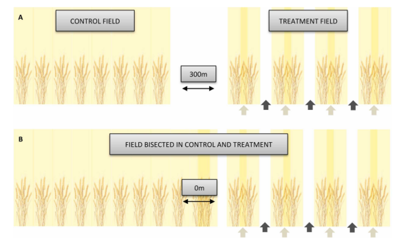 对照区(左)所有开沟器开放,形成“常规行”均匀播种模式。处理区(右)通过每4米工作宽度关闭2–3个开沟器(不减少播种量)改变播种模式,形成包含“未播种行”(开沟器关闭)和“密播行”(开沟器开放)的作物结构。图中深色箭头指示处理田的“未播种行”,浅色箭头指示“密播行”。对照区与处理区行距均为12.5–16.6 cm(因播种机而异),符合中欧常规小麦种植标准行距(Abichou et al., 2019)。(A) 独立对照田与处理田。为避免移动生物溢出效应,配对对照田与处理田最小间距为300米。所有涉及移动生物(步甲陷阱采样、捕食实验、害虫水平与作物损害观测)及相应微气候与结构测量的评估均在独立田块进行。(B) 分割田块(一半对照播种模式,一半处理播种模式)。为排除播种模式外其他因素对产量的影响,产量测量在同一田块内配对进行。
