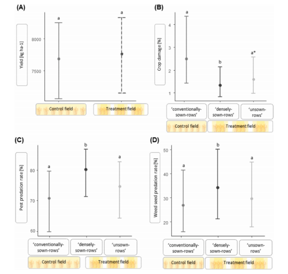 图4.冬小麦作物结构对产量、谷物叶甲造成的作物损害以及哨兵害虫和杂草种子捕食的影响。 图为广义线性混合效应模型的平均预测值。误差线显示89%置信区间(CI)。产量在对照田(均质播种模式,由“常规播种行”组成)和处理田(异质播种模式,由“未播种行”和“密播行”组成)中测量。作物损害以及害虫和杂草种子的自然控制则在对照田的“常规播种行”以及处理田的“密播行”和“未播种行”中测量。(A) 对照田和处理田的小麦产量无显著差异。(B) 以旗叶受损百分比衡量的作物损害,在“密播行”或“未播种行”中显著低于(b)或边缘显著低于(a*)“常规播种行”(a)。(C) 以被捕食的哨兵害虫百分比衡量的害虫捕食率,在“密播行”(b)中显著高于“常规播种行”(a)。(D) 以被捕食的哨兵杂草种子百分比衡量的杂草种子捕食率,在“密播行”(b)中显著高于“常规播种行”(a)。
