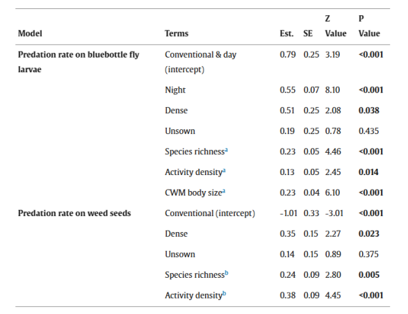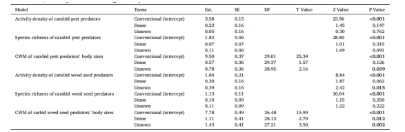 表3.分别解释害虫和杂草种子哨兵捕食率差异的广义混合线性模型摘要。 分析了白天/夜晚、作物结构(conventional指对照田中‘常规播种行’(无操纵作物结构);dense指处理田中‘密播行’,unsown指处理田中‘未播种行’(有操纵作物结构))、物种丰富度、活动密度以及潜在害虫捕食者(体型至少5.0 mm的肉食性和杂食性步甲)的群落加权平均(CWM)体型大小对害虫哨兵(蓝蝇幼虫)捕食率的影响。分析了作物结构(conventional指对照田中‘常规播种行’(无操纵作物结构);dense指处理田中‘密播行’,unsown指处理田中‘未播种行’(有操纵作物结构))、潜在杂草种子捕食者(体型在2.5至8.0 mm之间的植食性和杂食性步甲)的物种丰富度和活动密度对杂草种子哨兵(荠菜(十字花科,每粒种子0.1 mg)、 Tripleurospermum inodorum(菊科,每粒种子0.3 mg)、繁缕(石竹科,每粒种子0.4 mg)、早熟禾(禾本科,每粒种子0.4 mg)、紫花野芝麻(唇形科,每粒种子0.8 mg))捕食率的影响。根据各自的实验设置,害虫捕食实验的步甲数据来自12小时陷阱样本,杂草种子捕食实验的步甲数据来自7天陷阱样本。Est. = 估计值, SE = 标准误。P ≤ 0.05 的值以粗体显示。