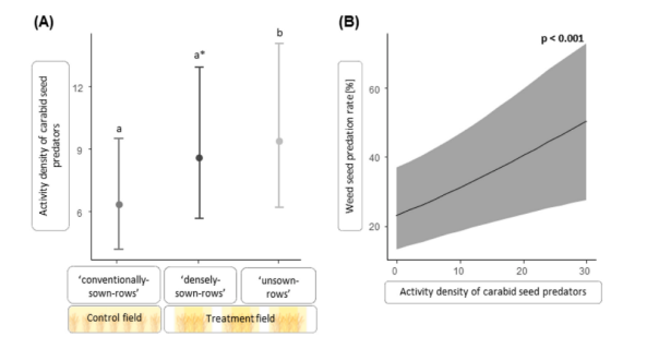图3.不同冬小麦作物结构下步甲种子捕食者的活动密度及其与种子被捕食的关系。广义线性混合效应模型的平均预测值。误差线显示89% CI。(A) 作物结构对步甲种子捕食者活动密度的影响。对照田中的‘常规播种行’具有均匀播种模式;处理田采用异质播种模式建立,包括‘未播种行’和‘密播行’。活动密度在‘未播种行’或‘密播行’中显著(b)或边缘显著(a)高于‘常规播种行’(a)。(B) 步甲种子捕食者活动密度与被捕食的杂草种子哨兵百分比呈显著正相关。*