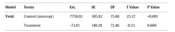 表5.解释无操纵作物结构的对照田(control)与有操纵作物结构的处理田(treatment)之间产量差异的混合线性模型摘要。 Est. = 估计值, SE = 标准误, DF = 自由度。P ≤ 0.05 的值以粗体显示。