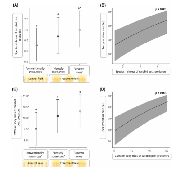 图2.不同冬小麦作物结构下步甲害虫捕食者群落的物种丰富度和体尺分布,以及这些群落描述因子如何影响害虫被捕食。(广义)线性混合效应模型的平均预测值。误差线显示89% CI。对照田中的‘常规播种行’具有均匀播种模式;处理田采用异质播种模式建立,包括‘未播种行’和‘密播行’。(A) 作物结构对步甲害虫捕食者物种丰富度的影响。‘未播种行’(a) 的物种丰富度边缘显著高于‘常规播种行’(a)。(B) 步甲害虫捕食者物种丰富度与被捕食的害虫哨兵百分比呈显著正相关。(C) 作物结构对步甲害虫捕食者体尺分布的影响。‘未播种行’(b) 的群落加权平均(CWM)体尺显著高于‘常规播种行’(a)。(D) 步甲害虫捕食者的体尺CWM与被捕食的害虫哨兵百分比呈显著正相关。*