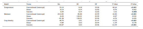 表1.解释不同作物结构(conventional 指对照田(无操控作物结构)中的‘常规播种行’;dense 指处理田(有操控作物结构)中的‘密播行’;unsown 指处理田中的‘未播种行’) 之间土壤表面温度、土壤湿度和作物覆盖度差异的混合线性模型摘要。Est. = 估计值, SE = 标准误, DF = 自由度。P ≤ 0.05 的值以粗体显示。
