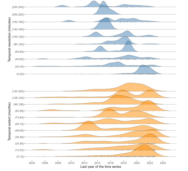 图4 微气候时间序列涵盖的时间分辨率与持续时间范围。本图展示了截至2024年4月SoilTemp数据库(Lembrechts等,2020)中温度时间序列数量的密度分布,该分布以时间序列的结束日期(即最后年份)为函数,呈现时间分辨率(分钟为单位)与持续时间(月为单位)的对应关系。
