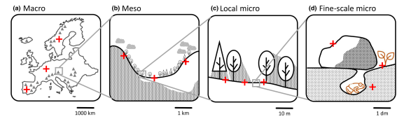 图6 小气候的嵌套性质。局地测量的小气候(如温度、湿度、风力)始终融合了局部、区域及全球尺度的气候信号。从宏观到微观的每一尺度上,气候梯度均可被解析,如同分形结构中复现的几何形态。(a)宏观尺度上,纬度梯度、大陆性特征及全球环流模式共同调控大气候;(b)中观尺度中,地形主导气候格局,甚至可逆转宏观温度趋势(例如通过垂直递减率、冷空气汇集、太阳辐射暴露等机制)。事实上,热带高海拔地区均温可能低于海平面高纬度区域(c和d);(c)微观尺度上,植被格局(如冠层覆盖)与微地形梯度成为核心驱动因子。例如低海拔森林区域可能较高海拔开阔草甸更为凉爽。根据测量数据的空间分辨率与范围,微观气候信号较宏观和中观尺度变异更易被分离。