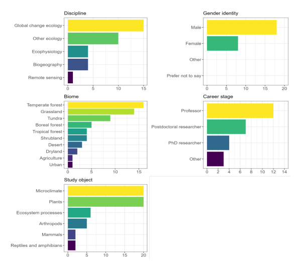 补充信息 图S2. 本文作者的人口统计学背景。我们提供了全部27位作者的背景信息。需要说明的是,作者在学科领域、主要研究生物群系及研究对象方面可进行多选标注。