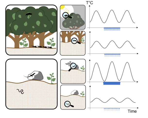 图5.在野外安装小气候数据记录仪时,为正确的空间位置设置正确的时间分辨率取决于关注混合物、物质(如环境空气或表土层)或表面(如叶面或岩石表面)的热导率及其对直接太阳辐射和主导风的暴露程度。左图描绘了两种不同的生境(即顶部的森林和底部的巨石区),其中不同的生物(如蜜蜂、蚂蚁、蜥蜴、蚯蚓)共享不同的微生境。右图图表的时间轴描绘了连续三天的昼夜温度波动。在第二天全过程中,蓝色箭头显示了温度读数的密度,或连续测量之间的时间分辨率,该分辨率根据日较差进行调整——对于高度暴露于直接太阳辐射和主导风的高导热性表面,采用更精细的时间分辨率。从蜜蜂的视角来看,树冠顶部的叶面温度波动比林下蚂蚁觅食处近地面的气温波动更大,这就要求前者的时间分辨率(例如每 10 分钟)比后者(例如每小时)更精细。类似地,对于在巨石区晒太阳并暴露于直接太阳辐射和主导风的蜥蜴而言,岩石表面温度波动比蚯蚓所感知的地下土壤温度波动更大,这也要求前者的时间分辨率(例如每分钟)比后者(例如每 2 小时)更精细。动物剪影下载自