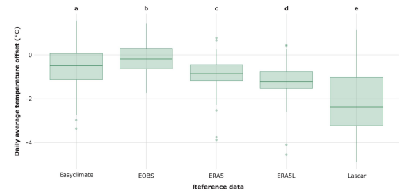 图7 参照数据选择的重要性。展示波兰某森林2018年6-10月日均温偏移值(林内温度减参照温度,负值表示更凉),使用不同参照源(easyclimate、EOBS等)计算。字母标注表示Kruskal-Wallis检验的显著差异。数据源自Meeussen等(2021)。