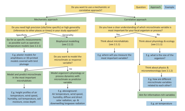 由于微气候具有精细的时空分辨率及复杂的潜在驱动因素(Gates, 2012),其测量与建模极具挑战性。因此,首先需要判断收集微气候数据是否必要。有时结合基于气象站数据(参见第8节)或网格化气候数据的大气候变量,以及精细空间分辨率下的静态地形变量,已能提供足够信息(Kearney & Porter, 2009)。研究者需首要回答的关键问题是:大气候变量是否能作为所关注生态响应的有效预测指标(正如其在理解物种分布等宏观生态格局时通常表现的那样)。例如,当需要接近实际生理限制时,微气候数据就变得必要(Bennie et al., 2014)。因此,决定是否监测微气候的关键在于:研究目标是采用相关性方法还是机制性方法将微气候与研究对象或过程相联系(图3)。