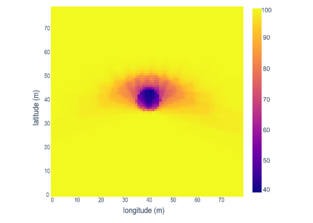 本模拟案例基于雷恩地区(研究区域中心的最大城市及气象站所在地)219W/m²的太阳辐射数据。桅杆对应中心像素点。图示表明:从35米外开始,遮荫效应完全消失。