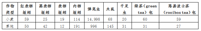 共收集了549条蚯蚓、15,994只弹尾虫、213只木虱和51只千足虫。在排除损坏的茶包后,回收了91个绿茶包和86个路易波士茶包(表1)。