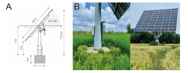 我们研究了Groupe OKwind®的光伏跟踪系统(图1A),其由117平方米的光伏板组成,支撑在7米高的桅杆顶部,因此下方仍可进行种植。光伏板通过双旋转轴在白天移动以跟踪并始终面向太阳。面板由双面单晶太阳能电池组成。这些跟踪系统的占地面积较小(6.25平方米),但混凝土基础附近无法耕作,使得杂草得以生长,尤其是在农田中(图1B)。