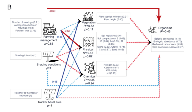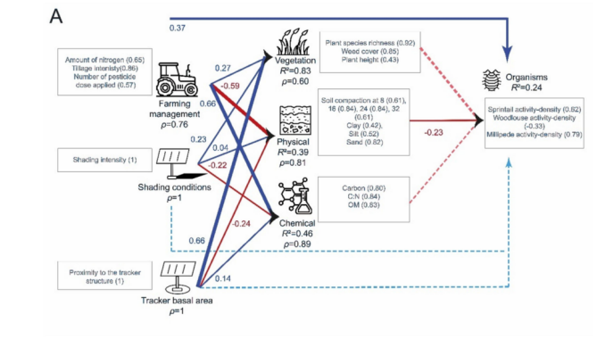 本研究旨在评估精准太阳能跟踪系统对农田土壤生物多样性的直接和间接(通过土壤及其植被覆盖的物理和化学特性)影响,同时考虑农业实践,特别关注遮荫和地面锚固的影响。具体而言,我们假设跟踪系统附近由于遮荫引起的微气候变化、自发植被的发展和安装过程中的土壤扰动,物理和化学条件将发生改变,从而影响土壤群落的活动。以法国西部的干草草地和冬麦田为研究对象,我们探讨了太阳能跟踪系统如何影响环境条件,并随后使用偏最小二乘路径模型(PLS-PM)量化了跟踪系统和农业实践对土壤生物多样性的直接和间接影响的相对重要性。