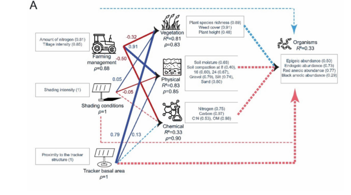 据我们所知,这项研究是首批探讨农业光伏(agrivoltaic)PV结构对土壤生物(尤其包括蚯蚓)影响的研究之一(Lambert et al., 2023, Menta et al., 2023)。它将先前关于草地的研究(Bai et al., 2022, Choi et al., 2023, Hassanpour Adeh et al., 2018, Vervloesem et al., 2022)扩展到一年生农田,在我们的案例中是冬小麦田。我们关注负责土壤有机质循环的分类群,以评估太阳能跟踪器的存在是否会相对于农业实践对土壤生物多样性施加额外的限制,或者相反地创造更有利的条件。我们的结果清楚地表明,太阳能跟踪器确实影响环境条件(即土壤的物理和化学性质以及植被特征),其强度取决于与跟踪器的距离,这进而影响土壤生物多样性。然而,无论考虑何种生物类群和土地覆盖类型,农业实践仍然是生物多样性格局的主要决定因素,其影响超过太阳能跟踪器。