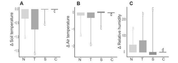 图7. 温度(℃;A-B)和相对湿度(原始TDT数据;C)的平均值。字母表示通过Tukey事后检验得出的不同位点间显著性差异(p < 0.01)。N=北侧,T=追踪器基座,S=南侧,C=对照组。