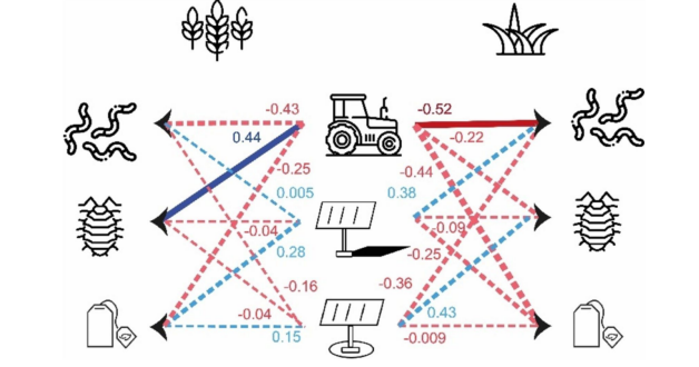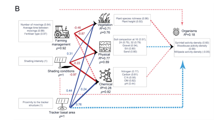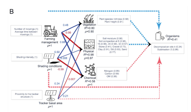 通过偏最小二乘路径模型(PLS-PM)分析,我们成功构建了环境变量与土壤生物多样性之间的复杂关系模型。总体而言,农业管理实践是解释土壤生物多样性的最重要因素,而太阳能追踪器的影响十分有限——当综合考虑两类变量对其他变量的多重影响时,其影响甚至不显著(图9、图10、图11、图12)。