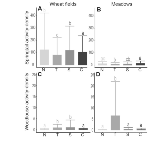 图5. 冬小麦田与干草草甸中跳虫(A-B)和潮虫(C-D)的平均活动密度(均值±标准差)。字母表示通过Tukey检验得出的不同位点间显著性差异(p < 0.05)。N:北向8米处;T:追踪器基座1米处;S:南向8米处;C:35米对照点。