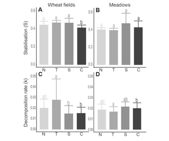图6. 冬小麦田与干草草甸中稳定化指数(S;A-B)和分解速率(k;C-D)的平均值(均值±标准差)。字母表示通过Tukey检验得出的不同位点间显著性差异(p < 0.01)。N:北向8米处;T:追踪器基座1米处;S:南向8米处;C:35米对照点。