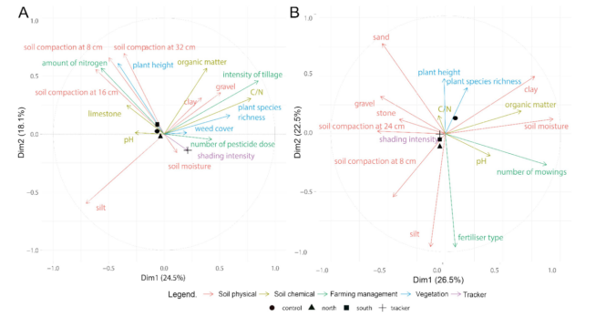 对于冬小麦田,我们保留了前两个PCA轴,它们解释了总方差的42.6%(图8A;表S5.1)。第一轴(24.5%)将具有高耕作强度、高植物物种丰富度和高碳氮比的采样点与具有高土壤紧实度、高粉粒和高氮含量的采样点区分开。第二轴(18.1%)主要将具有高土壤氮含量、高有机质含量、高土壤紧实度和高植物高度的采样点与具有高粉粒含量的采样点对立起来。跟踪器基座(tracker basis)的重心(barycentre)位置与其他位置明显不同。