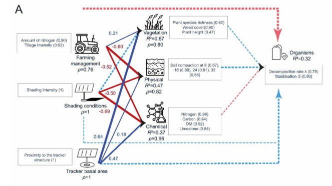 可再生能源技术快速发展,太阳能是最具前景的能源之一。农业光伏能在同一块土地上实现作物种植与能源生产的结合。尽管许多研究探讨了地面安装太阳能电池板对未耕种草地的影响,但很少有研究关注农业光伏结构,尤其是采用二维转向支架且地面锚固有限的双轴跟踪系统。我们研究了此类跟踪系统(通过锚固对耕作实践的限制以及移动遮荫)对麦田和草地土壤物理、化学和生物特性的相对影响,并与已知影响这些特性的耕作实践进行了对比。通过PLS-PM分析发现,尽管跟踪器附近化学条件有所改变,且光伏结构带来了更高的特定植物丰富度,但与农业实践相比,其对生物群落并无显著影响。对比干草草地和麦田的结果表明,影响存在差异,需在不同农业背景下开展进一步比较研究。