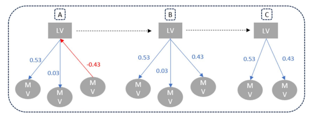 在第二个模型中,我们确保了潜变量的单维性(即与一个潜变量相关的所有测量变量必须与其正相关)。然后,所有与潜变量负相关的测量变量乘以-1,以在运行最终模型之前保持单维性(图4B);
