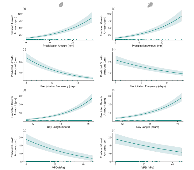 图S6. 基于欧洲水青冈模型(a, c, e, g)和欧洲白栎模型(b, d, f, h)预测的生长量(GROamount):(a–b)降水量,(c–d)降水频率,(e–f)日长,以及(g–h)蒸汽压亏缺(VPD)