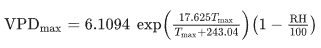 从气象站测量中计算了几个指标。首先,水汽压差(VPD)被纳入,因为除了土壤水分状况外,它是与水分相关的树干半径变化的主要驱动因素(Brinkmann等,2016;Ehrenberger等,2012;Nehemy等,2021)。VPD是根据每日最高气温(Tmax)和相对湿度(RH)计算的,使用August-Roche-Magnus方程(Alduchov和Eskridge,1997)确定每日最大VPD(VPDmax):