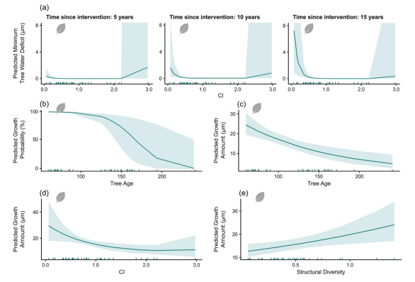 图5. 所有模型中受伐木干预影响变量的偏依赖图。(a)竞争指数(CI)与干预时间(Timeintervention)对欧洲水青冈TWDmin的交互效应。(b-c)树龄对欧洲水青冈GROprob和GROamount的影响。(d-e)竞争指数(CI)与结构多样性分别对欧洲水青冈GROamount的影响。