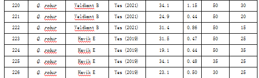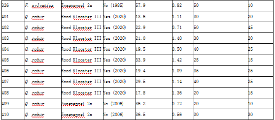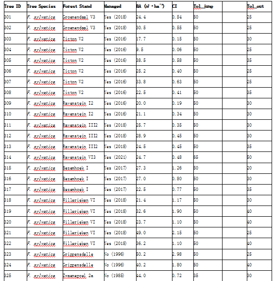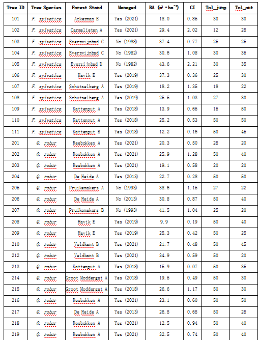 表S1. 该表概述了在Meerdaal森林中选定的树木及其特征。‘Managed’列表示该林分目前是否处于积极管理状态,以及该林分最后一次管理的年份。表中还包括了R包‘treenetproc’算法所使用的tol_jump和tol_out的输入值。请注意,tol_jump和tol_out是输入值,而不是应用的实际阈值。