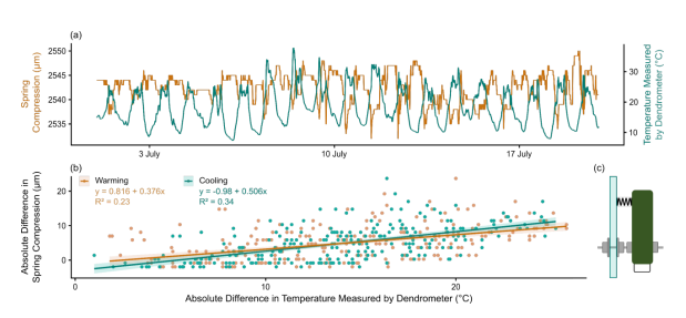 图S2. (a) 2023年7月安装在派热克斯玻璃板上的点式树木径向生长仪的弹簧压缩信号与温度测量示例;(b) 升温期(温度上升阶段)和冷却期(温度下降阶段)弹簧压缩差值与温差的对应关系图;(c) 点式树木径向生长仪在派热克斯玻璃板上的安装示意图。