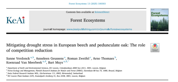 原文题目:Mitigating drought stress in European beech and pedunculate oak: The role of competition reduction