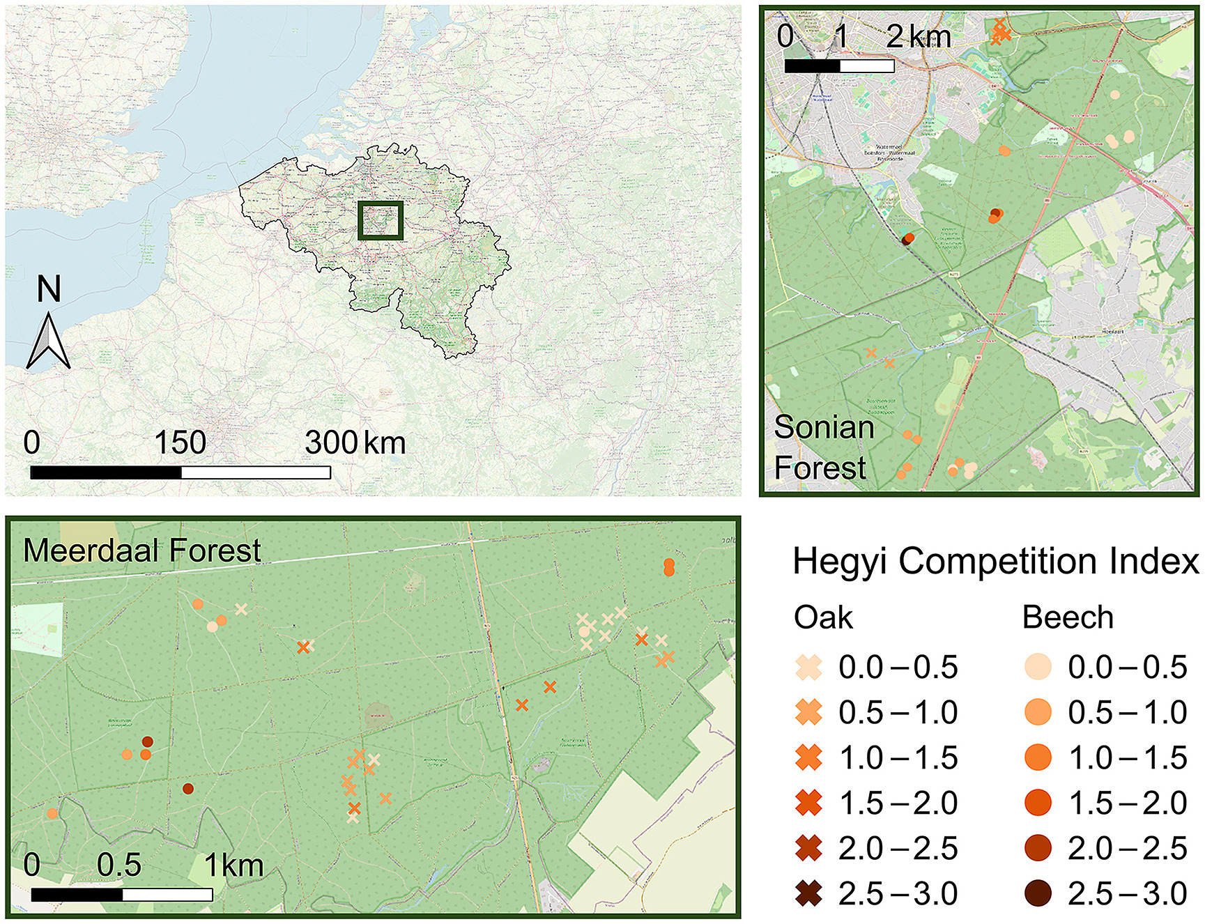 图1. 研究区域概览,显示梅尔达尔森林与索尼亚森林在比利时境内的位置及样地分布。欧洲水青冈(37个样地)与夏栎(35个样地)的颜色梯度表示赫吉竞争指数(Hegyi Competition Index)所表征的竞争强度变化范围,从未经经营管理的森林保护区(高竞争指数)延伸至集约经营林分(低竞争指数)。