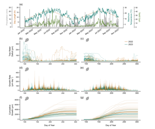 图3.(a) 2022年与2023年多项气象特征,包括最高气温、饱和水汽压差(VPD)、降水量及昼长。(b–g) 2022和2023年生长季期间,欧洲栓皮栎(左)与欧洲山毛榉(右)的树木水分亏缺(TWDmin)、生长速率及累积生长量。粗线表示所有监测树木的平均响应(背景细线为个体数据)。