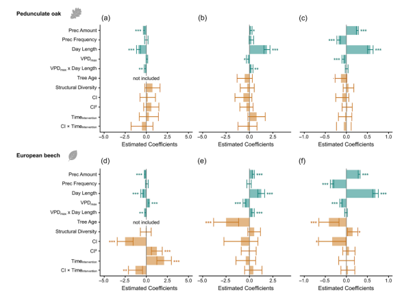 除经营管理外,日长、饱和水汽压差(VPD)及降水量也是关键变量。欧洲水青冈和有柄栎对这些变量的响应在显著性和影响程度上表现相似。