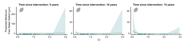 图S3. 干预后时间与CI(冠层开度)交互作用对欧洲水青冈最小树干收缩量(TWDmin)的影响