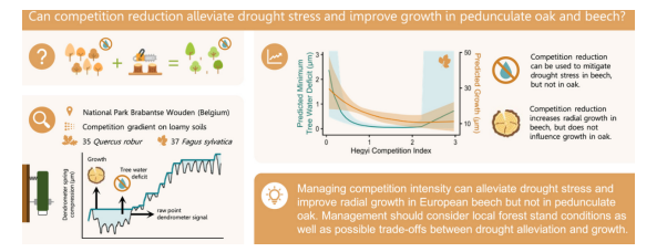 干旱对全球森林生态系统构成重大威胁。需要采取因地制宜的有效森林管理策略以减轻干旱的负面影响,其中竞争调控是通过提升水分可利用性来缓解干旱胁迫的重要措施。本研究以欧洲水青冈(Fagus sylvatica)和夏栎(Quercus robur)为对象,在比利时布拉班特伍登国家公园沿竞争强度梯度布设72棵树木的点式树木径向生长记录仪,通过每日最小树木水分亏缺(TWDmin)量化干旱胁迫,并结合日径向生长量分析竞争强度的影响。研究结果显示:
