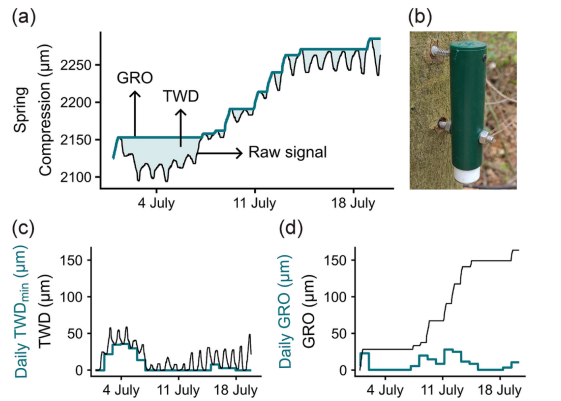 图2.(a) 2022年7月一株有柄栎树木质部径向变化原始信号示例。根据零生长概念(Zweifel等,2016)确定了树木水分亏缺(TWD)和径向生长量(GRO)。(b) TOMST点式树木径向变化测量仪安装于欧洲水青冈树干的情形。(c) 通过零生长概念从原始信号中提取TWD,并转换为日最小TWD值。(d) 根据树木累积GRO数据提取每日GRO增量。