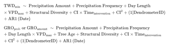 本研究采用‘glmmTMB’程序包(Brooks等,2017)构建广义线性混合模型(GLMMs)。响应变量(TWDmin、GROdaily)呈零膨胀伽马分布,需采用广义模型进行拟合。针对TWDmin,选择Tweedie分布处理零值问题;针对GROdaily,采用伽马栏栅模型进行两阶段分析:首先通过逻辑回归建立径向生长概率模型(GROprob),其次对存在生长的天数(GROdaily > 0),使用伽马分布对实际观测生长值(GROamount)进行建模。具体拟合模型如下: