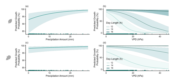 图S5. 基于欧洲水青冈模型(a–b)和欧洲白栎模型(c–d)预测的生长概率(GROprob):(a, c)降水量和(b, d)日长与蒸汽压亏缺(VPD)交互作用的影响