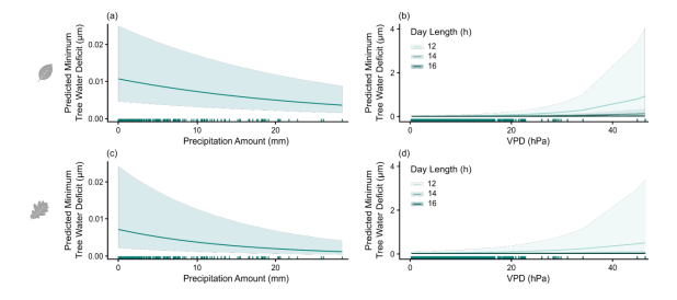 图S4. 基于欧洲水青冈模型(a–b)和欧洲白栎模型(c–d)预测的最小树干收缩量(TWDmin):(a, c)降水量和(b, d)日长与蒸汽压亏缺(VPD)交互作用的影响