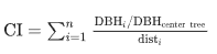 为了描述由采伐干预引起的竞争强度梯度,考虑了两种描述符。首先,选择了Hegyi竞争指数(CI)(Hegyi,1974)来量化中心树所经历的竞争。CI的计算公式为: