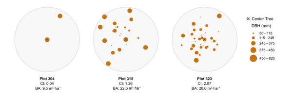 图S1. 三个欧洲山毛榉样地内树木及其胸径(DBH)的可视化分布图,每个样地半径为18米。图中展示了具有最低、中等和最高Hegyi竞争指数(CI)的样地。请注意,基面积(BA)与竞争指数不一定相关。